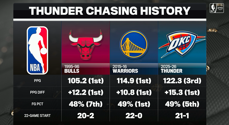 衛冕冠軍雷霆今季的強勢表現難免讓人猜測他們能否挑戰史上最佳戰績的73勝9負。今天賽前將雷霆與當年的公牛及勇士前22場賽事比較,無疑勇士的表現最具說服力,他們在得分、勝分差、命中率都排在聯盟第一,更是取得開季22連勝;公牛則在得分、勝分差,排在聯盟第一,戰績為21勝1負。