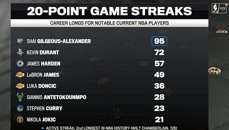 SGA的連續攻入20分場次紀錄已經擴大至95場,有望打破歷史第一Wilt Chamberlain的126場。