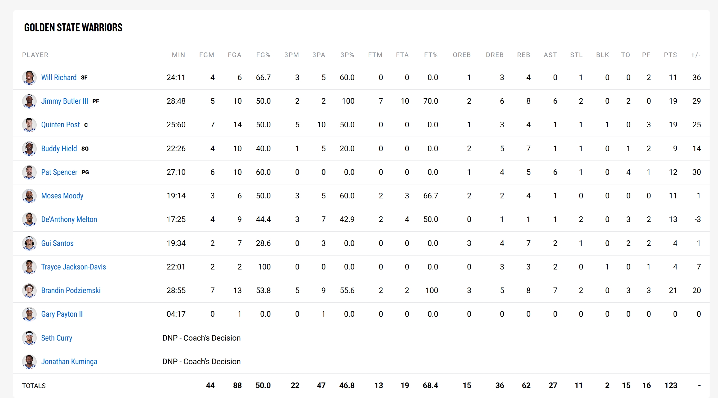勇士今仗有多達七位球員得分上雙位數,其中Jimmy Butler以10投5中攻入19分,並有8籃板、6助攻和2搶斷。Quinten Post同樣攻入19分。後備上陣的Brandin Podziemski則攻入全隊最高的21分。Buddy Hield今日外線手感冰冷,5次出手三分球僅命中1球。