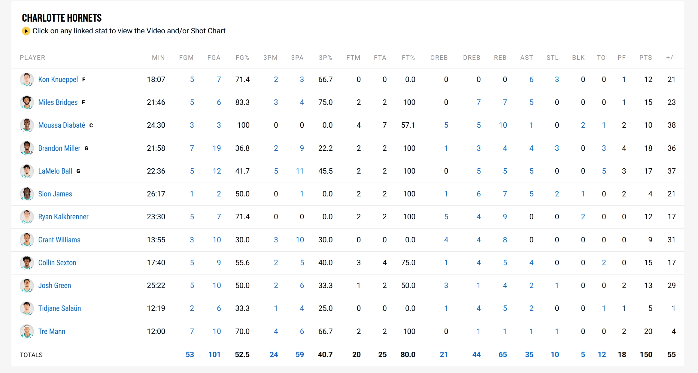 LaMelo Ball僅上陣22分半鐘,以12投5中攻入了17分,並有5籃板和5助攻。LaMelo今仗三分球11投5中,令他生涯三分球入球總數突破800球。他打破了Duncan Robinson的紀錄(263場),成為NBA史上用最少場數(260場)達成這項里程碑的球員!