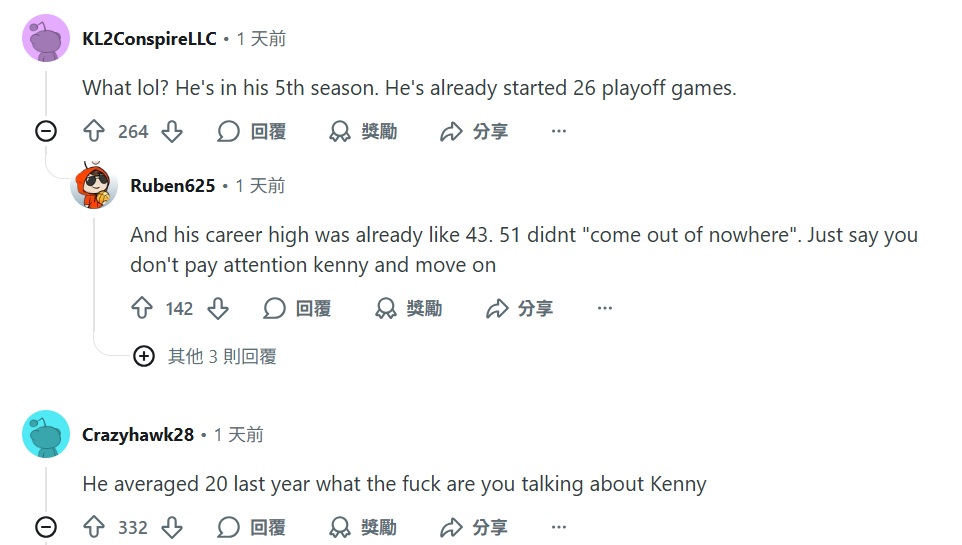 若 Smith 以為只會面對節目同事的質疑,那就大錯特錯。Reddit 網友對其言論展開熱烈討論,多數人對這項比喻感到失望。一名用戶指出:「什麼?這已經是他第五個賽季,他早在季後賽先發上陣 26 場了。」另一網友則諷刺道:「他生涯最高得分本是 43 分,現在攻入 51 分並非突然爆發。Kenny 就直接承認你沒關注比賽吧。」